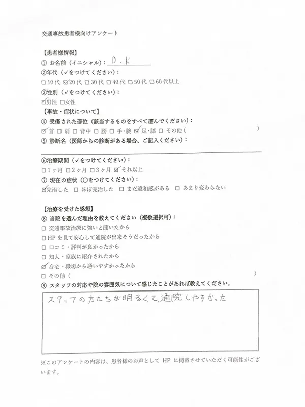 - スタッフの対応や院の雰囲気について感じたことがあれば教えてください。 スタッフの方たちが明るくて通院しやすかった。