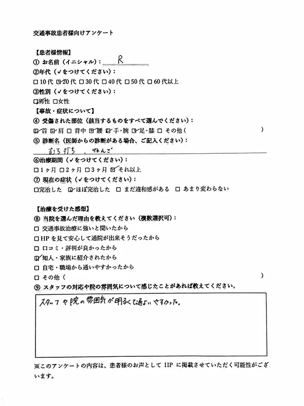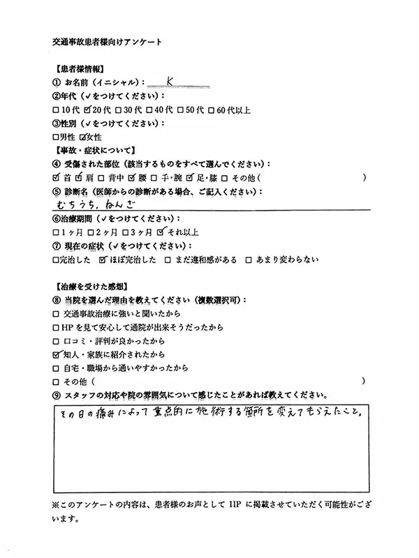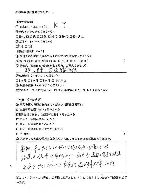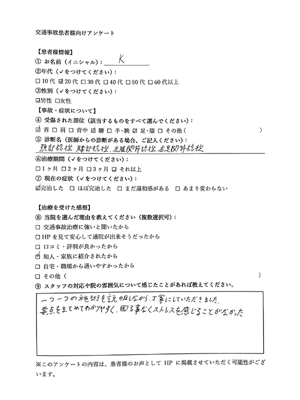- スタッフの対応や院の雰囲気について感じたことがあれば教えてください。 一つ一つの施術を説明しながら丁寧にしていただきました。要点をまとめてわかりやすく、困る事なくストレスを感じることがなかった。