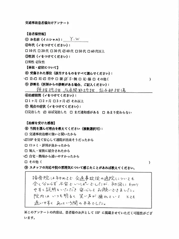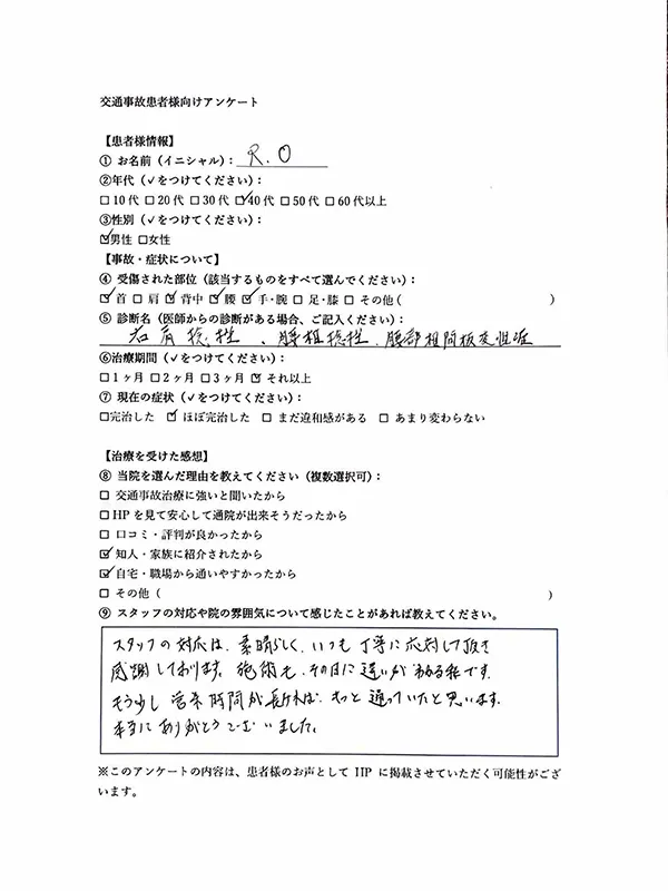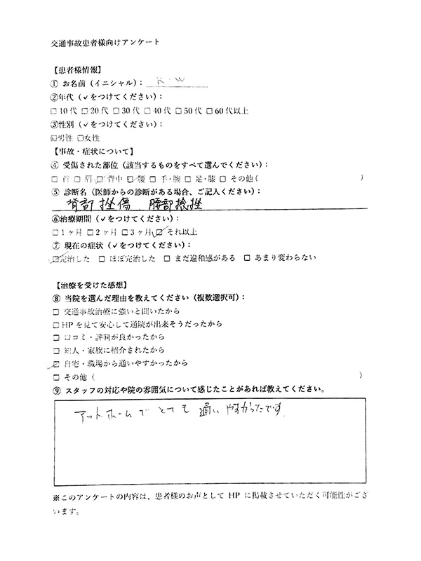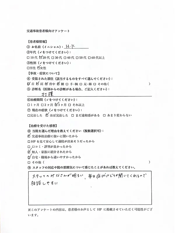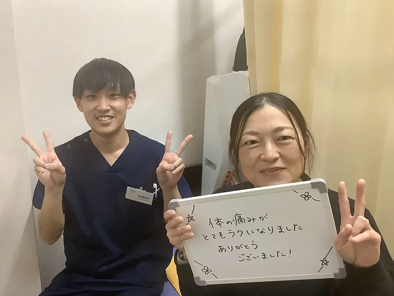 - スタッフの対応や院の雰囲気について感じたことがあれば教えてください。 明るく元気な挨拶、声掛け、コミュニケーションがとれていて来やすく安心する。交通事故が元で通い始める上で弁護士のさんの紹介から治療のアドバイスまで、まめに対応してくれました。完治までしっかり対応してくれて感謝しています。ありがとうございます。